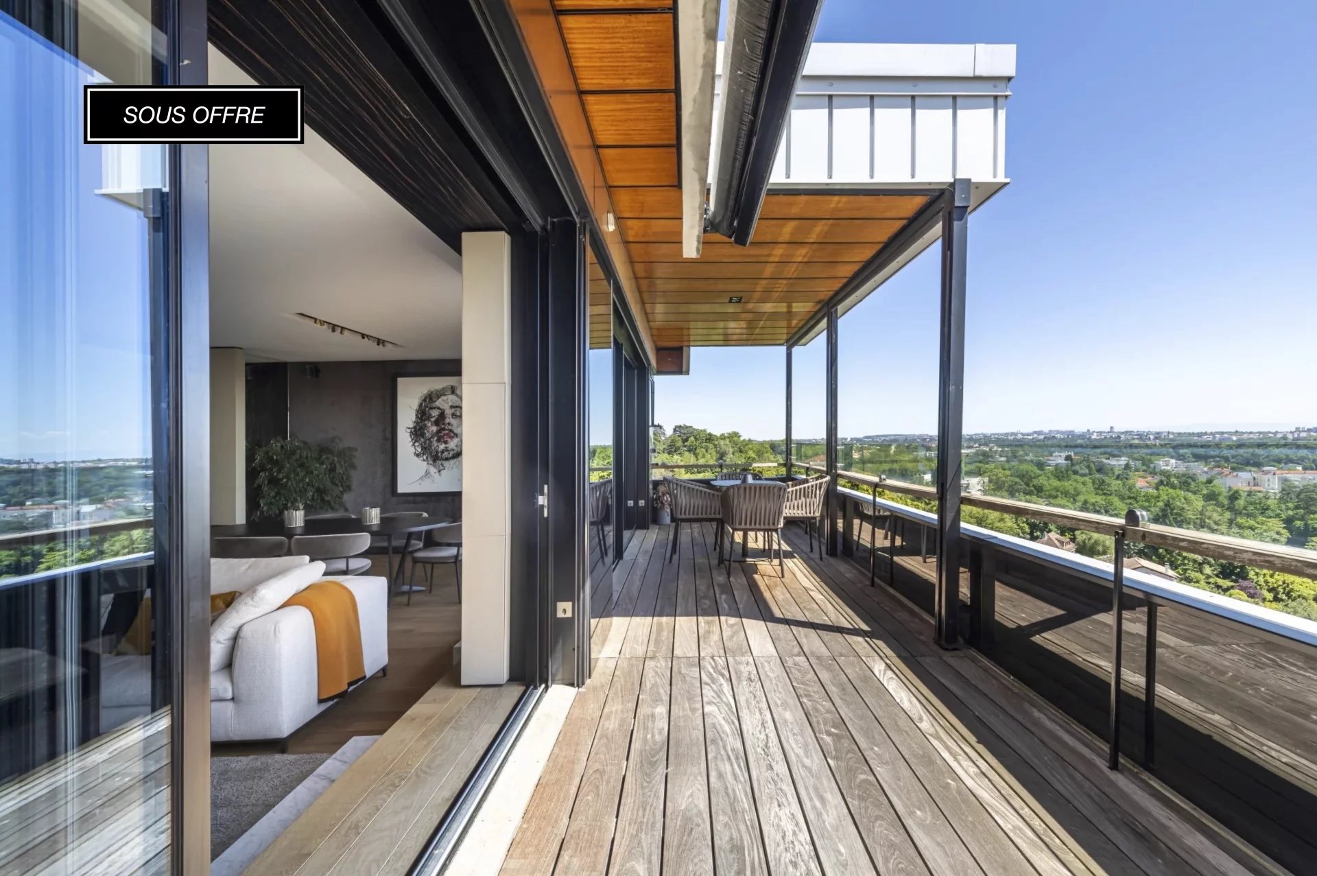 Exceptional and exclusive to Majoux-Virieux. Unoverlooked top floor, fully air-conditioned. Absolute peace and quiet for this exceptional 160 m2 flat with a panoramic view over Lyon and the Fourvière basilica. Refined, elegant renovation using top-quality materials. A light-filled 72 m2 living space with an open-plan kitchen, a lounge with fireplace and a dining room opening onto a 21 m2 terrace. The sleeping area: Two suites with walk-in shower leading onto another 16 m2 terrace. Plenty of storage space and a custom-made dressing room. Reversible air conditioning. Magnificent wooded grounds in a secure, luxury condominium with swimming pool, tennis court, former orangery (games room) and caretaker. A large 36 m2 double garage and a 10 m2 cellar complete this property. Located in the lower part of St Didier, with quick access to Lyon's northern ring road, on the peninsula and in the 6th arrondissement. Exclusive to MAJOUX-VIRIEUX Immobilier. Marie-Pierre ANDRILLAT 06 76 08 61 81